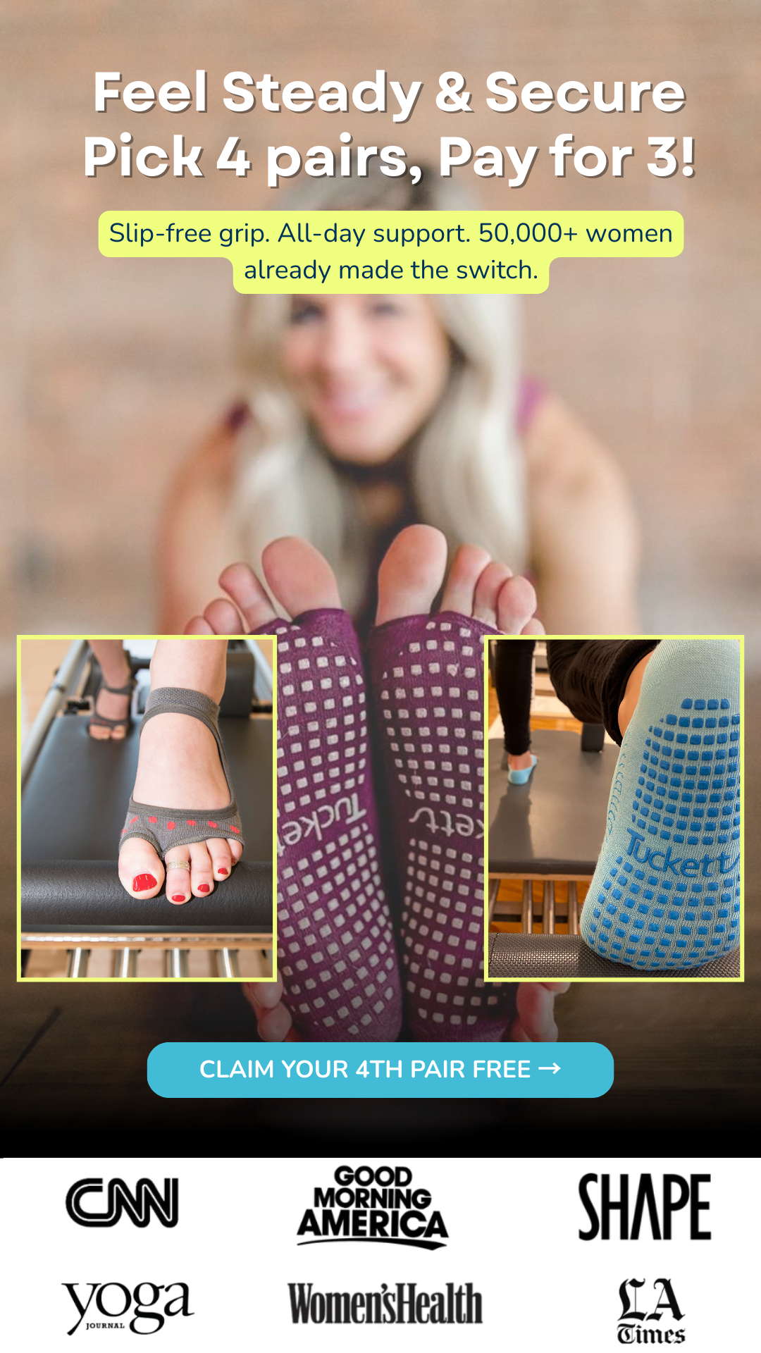 With superior anti-slip grips for any surface, and an easy-to-wear toeless design, Tucketts grip socks give you the comfort, style and security to step into any barefoot activity. Tucketts are for every body, every age, every sole.