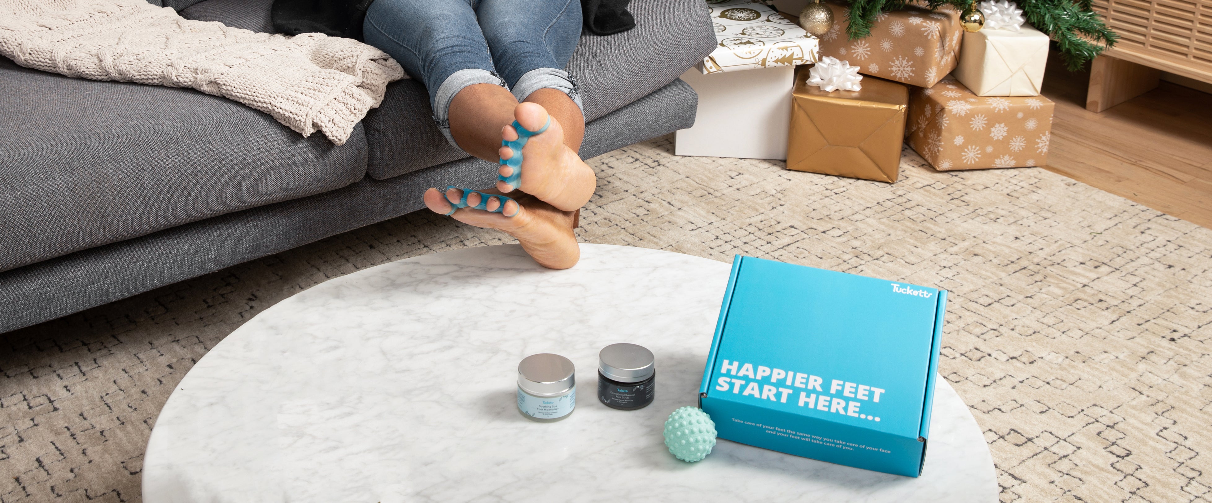 - Apply Tucketts Soothing Foot Spa Moisturizer to your feet.