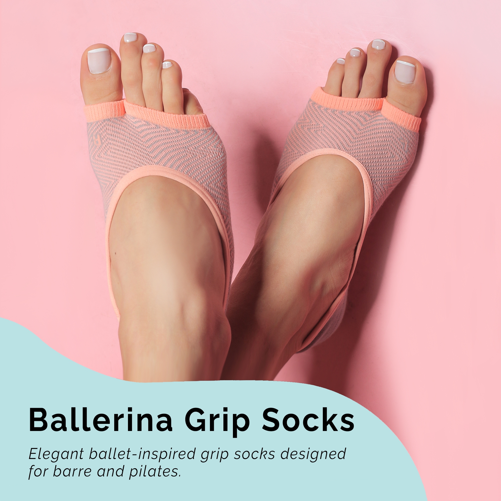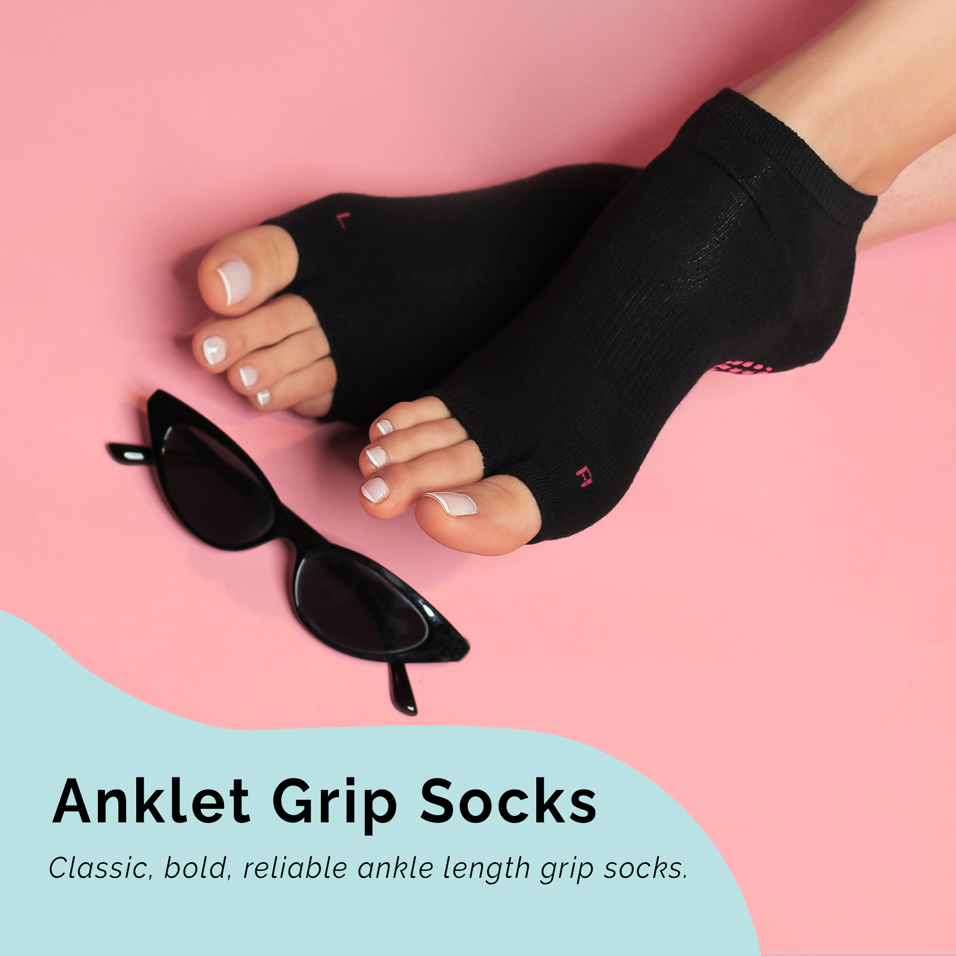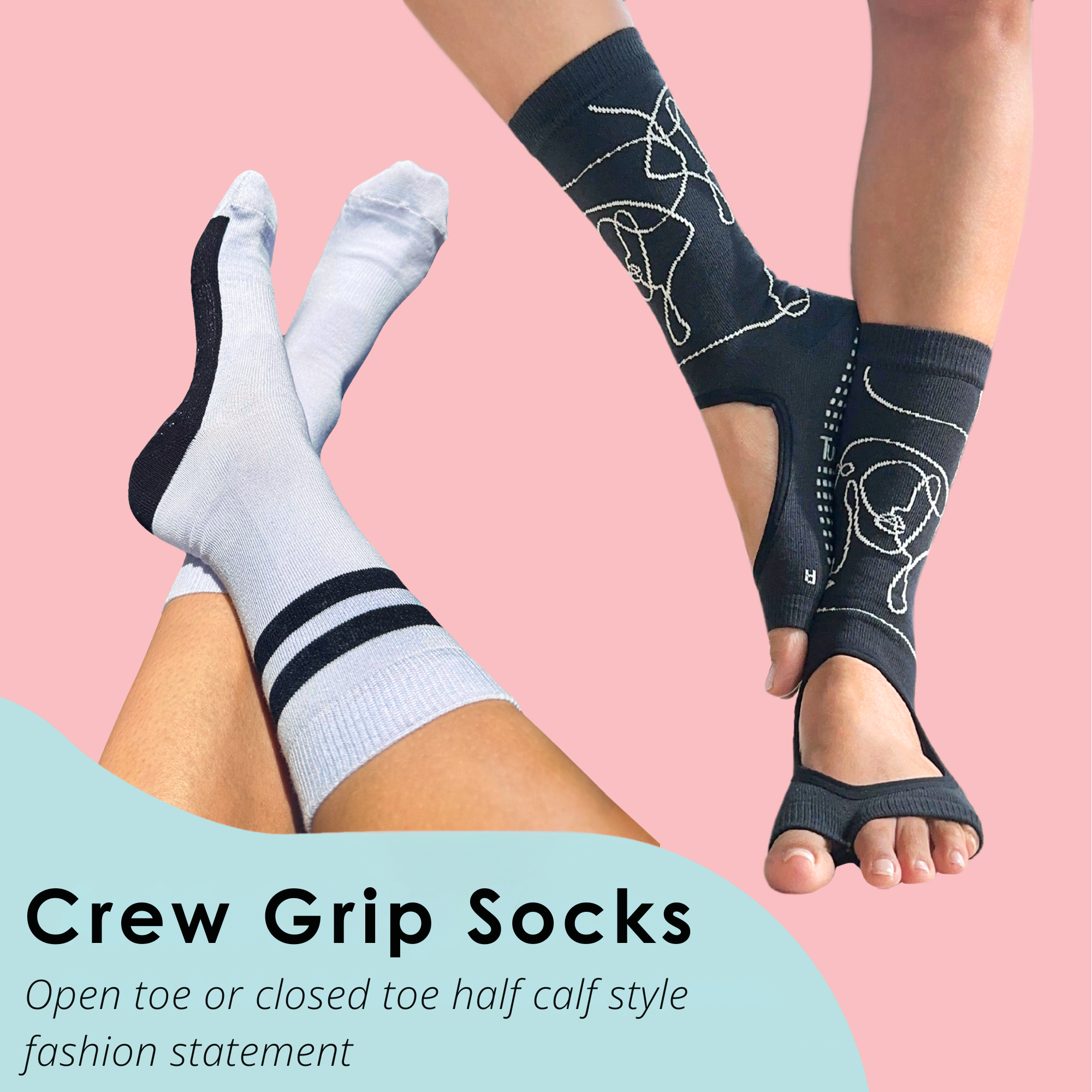 Our crew-length socks are designed with an anti-slip grip sole to help you feel confident and stable while exercising. Available in 3 styles: open toes, open toes-allegro & closed toes.